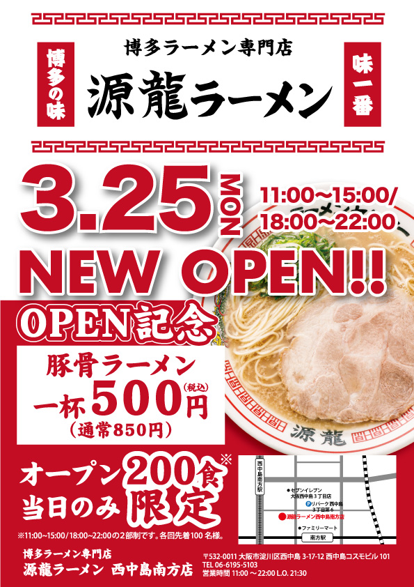 2024年3月25日(月)11:00、大阪のビジネス街、西中島南方に、本場博多の味、飽きのこない町の豚⾻ラーメンを再現した博多ラーメン専⾨店 『源龍ラーメン(げんりゅう)西中島南方店』をオープンいたしました。
