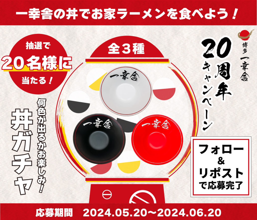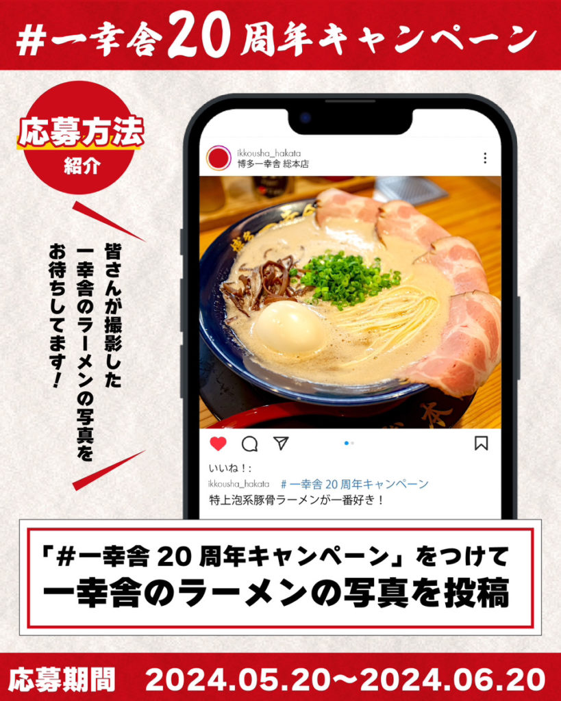 ・応募方法:「#一幸舎20周年キャンペーン」 をつけて一幸舎のラーメンを投稿